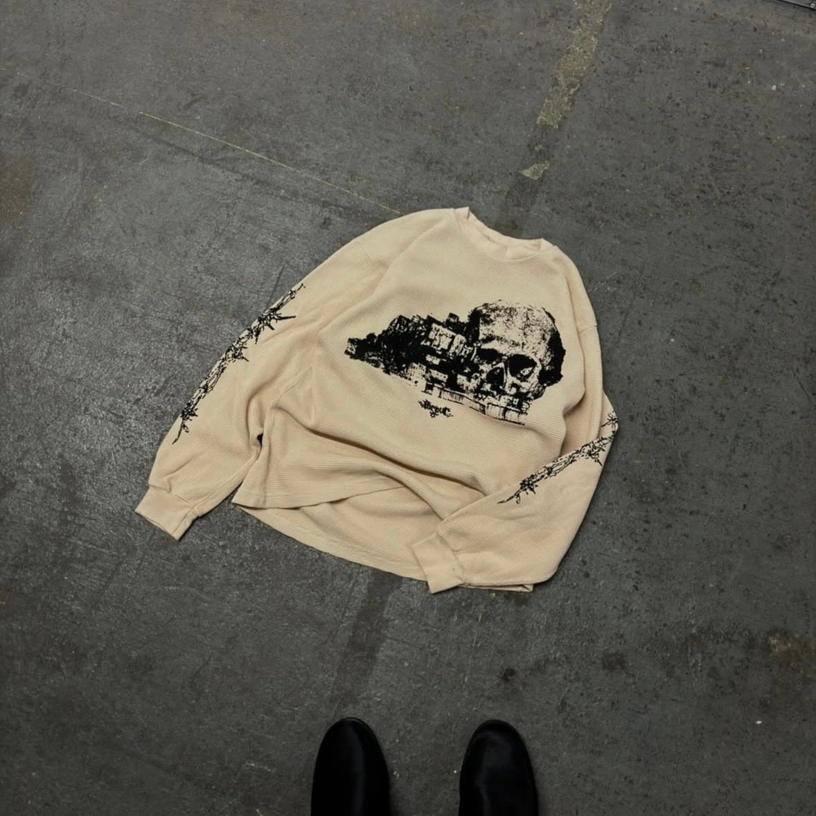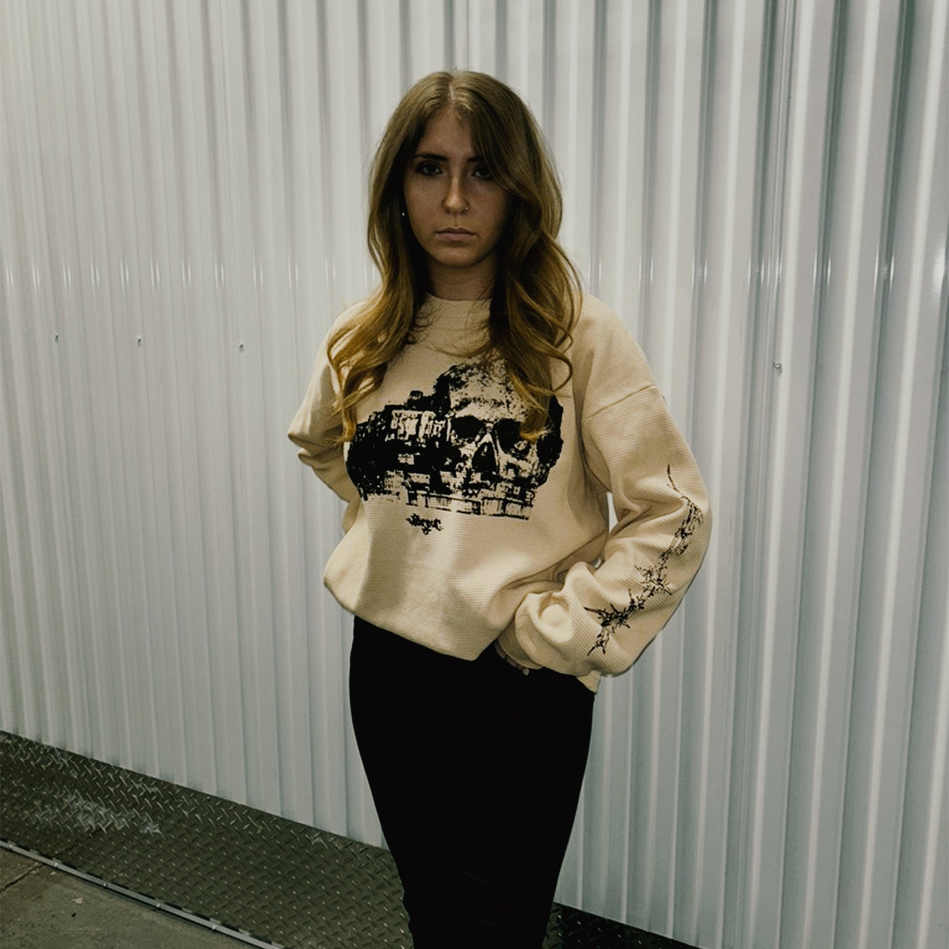 Alana is 5'7" and wearing a size large Castles thermal. Dropped shoulders create a baggy silhouette, but a boxy, cropped look on the waist.